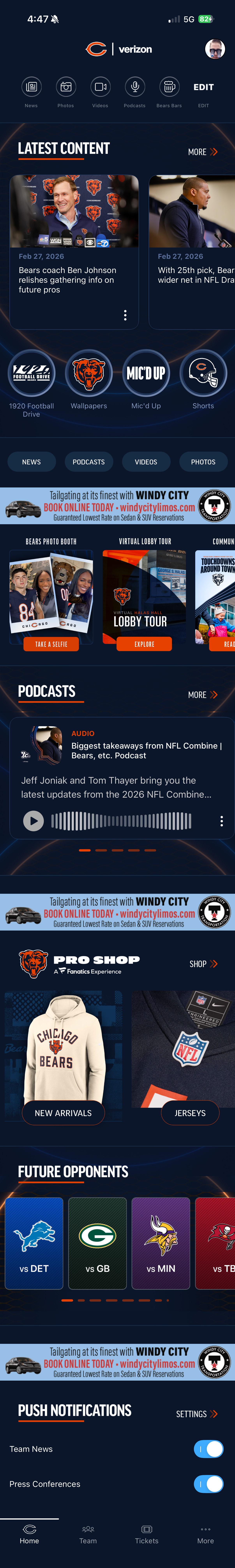 I re-designed the home screen layout and functionality of the Chicago Bears app.